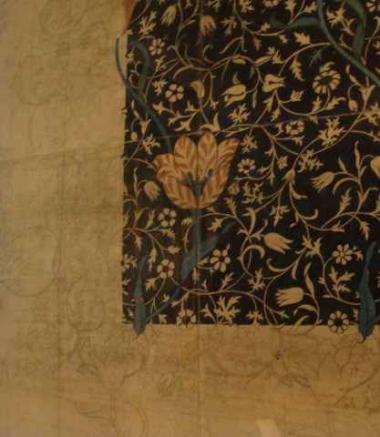 館内には、主にモリスのデザインした模様画(鉛筆での下書き+色彩したもの)と、そのデザインをカーペットやカーテンに転写した作品、それにモリスに関連した人物の作品と彼自身に関する資料が展示されている。